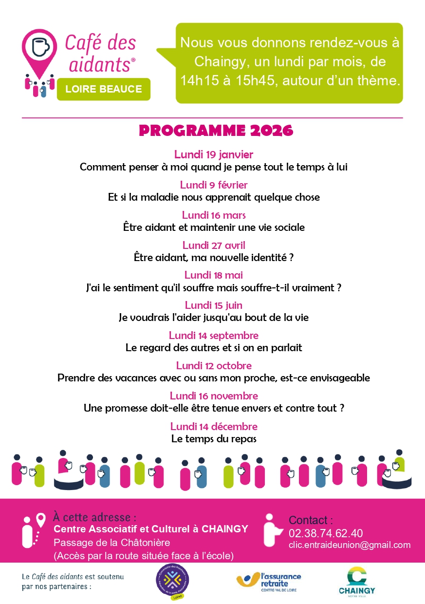 Le CLIC co-anime également le Café des Aidants Loire Beauce. Rdv à Chaingy un lundi par mois, de 14h à 15h30 autour d'un thème. CENTRE ASSOCIATIF et CULTUREL DE CHAINGY Passage de la Chatonière (accès par la route située face à l'école) 02.38.74.62.40 - 02.38.65.48.77 - clic.entraideunion@gmail.com |